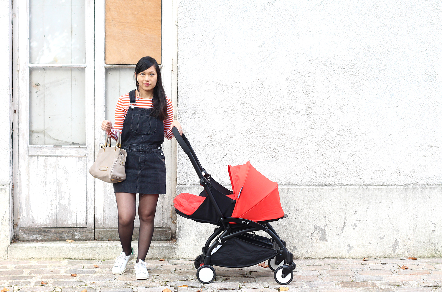 On a profité d’une sortie avec baby le week-end dernier pour shooter cette tenue. Le fait d’être parfaitement assortie à la poussette, c’est un pur hasard! La poussette, c’est la fameuse Yoyo de Babyzen qu’on a choisie pour son côté compact et maniable et on ne le regrette pas du tout.